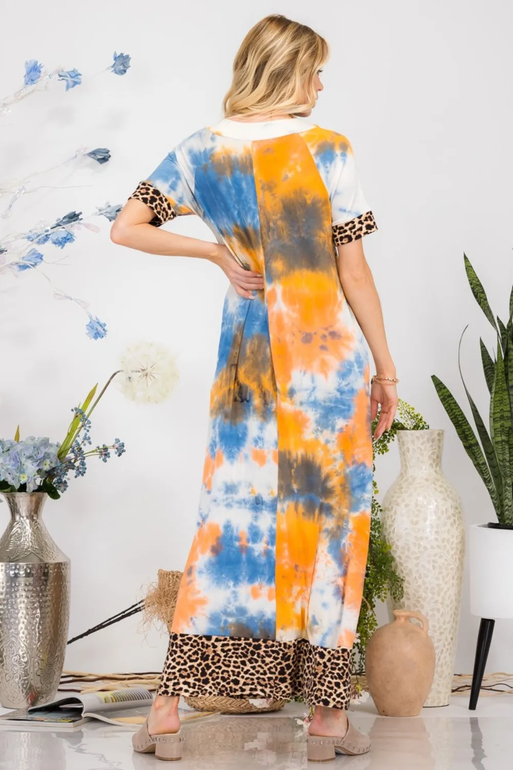 Full Size Leopard Tie-Dye Button Detail Short Sleeve Maxi Dress Plus Size – Orange Tie Dye