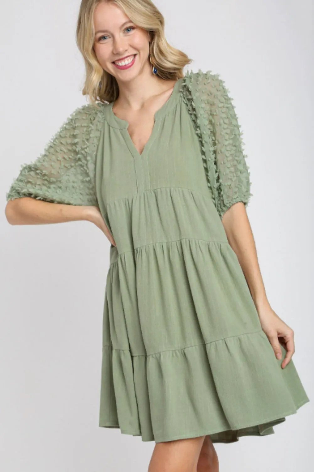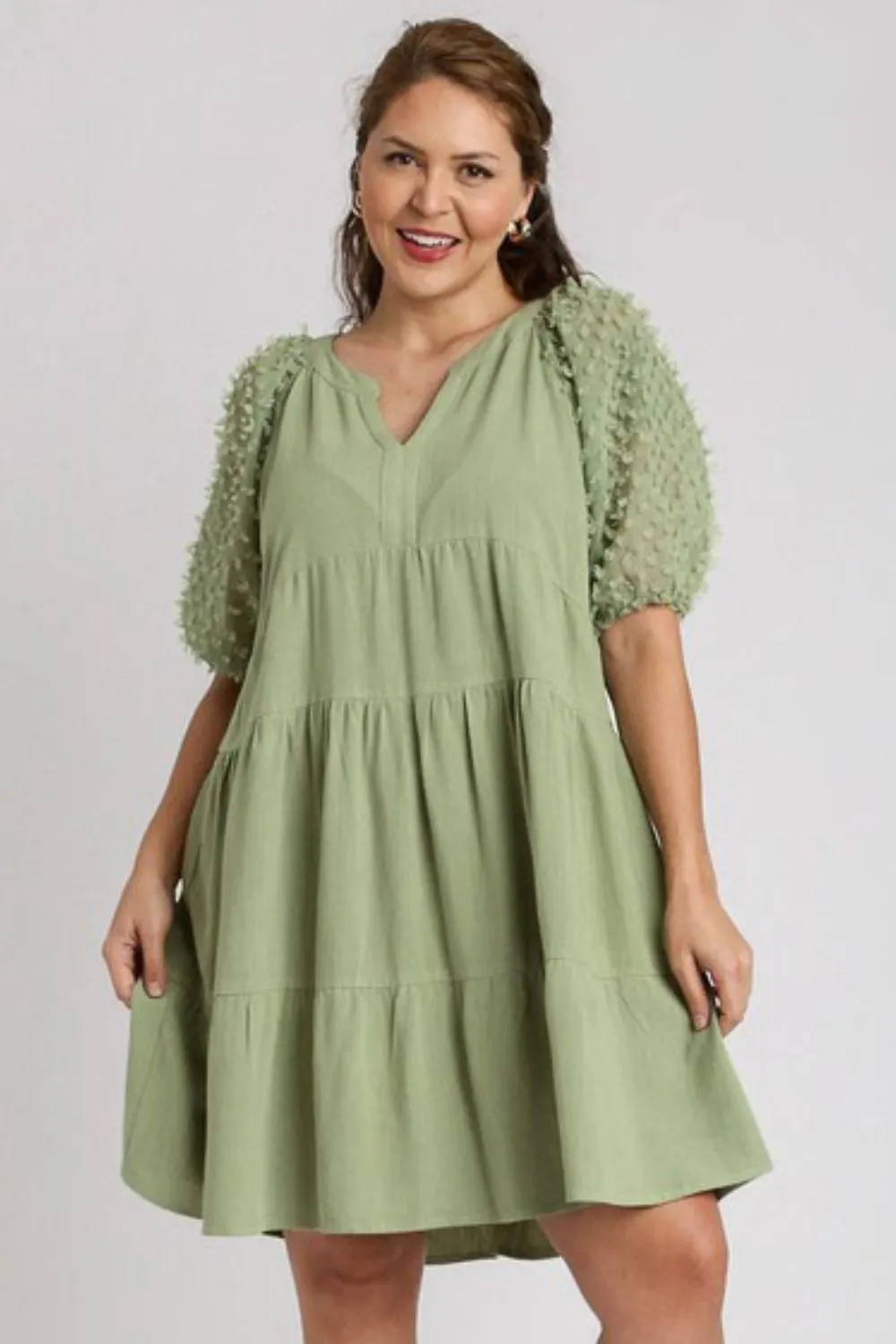 Full Size Linen Tiered A-Line Split Neck Dress Plus Size – Sage