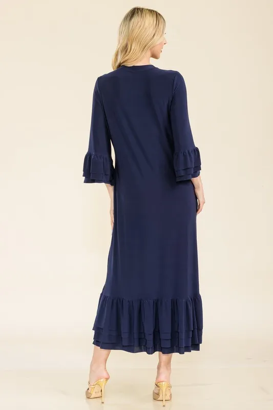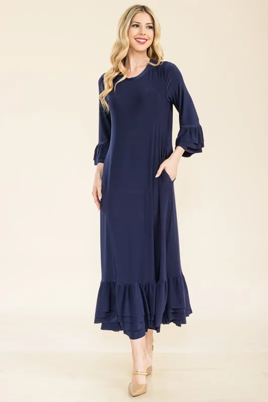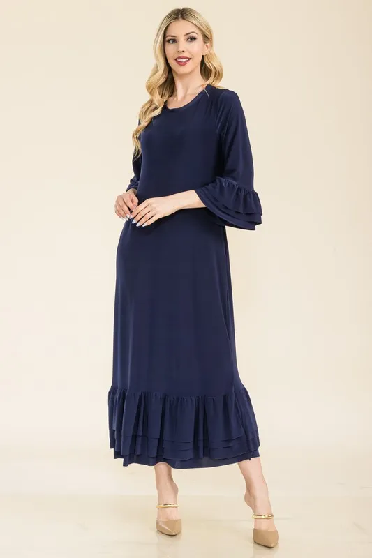 Full Size Modest Midi Dress with 3/4 Ruffle Bell Sleeves Plus Size – Navy
