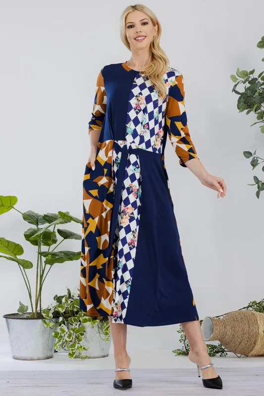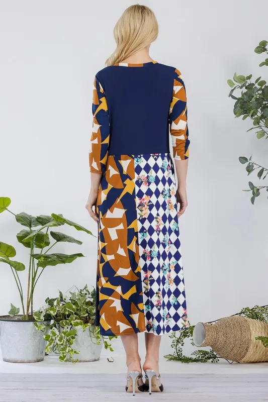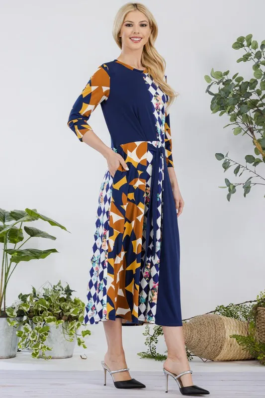 A new mixed pattern midi-dress is here to embrace you with a flowy silhouette, 3/4 sleeves, adjustable tie detail to give you some shape, and hidden side pockets! This midi-dress is perfect for the summer fall transition! Pair it with your favorite accessories, and jacket to make an effortless chic outfit!