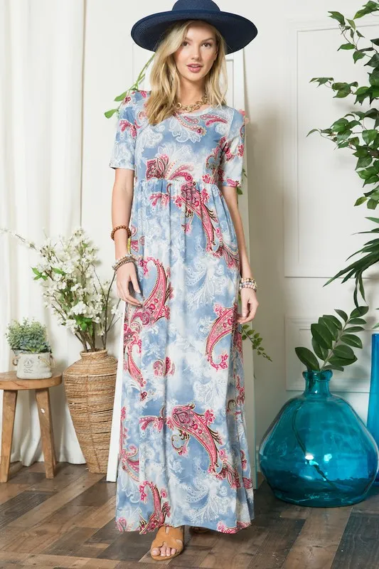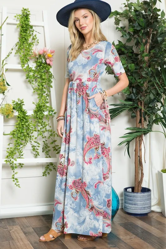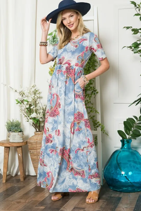 Full Size Paisley Print Short Sleeve Maxi Dress with Pockets Plus Size – Light Blue