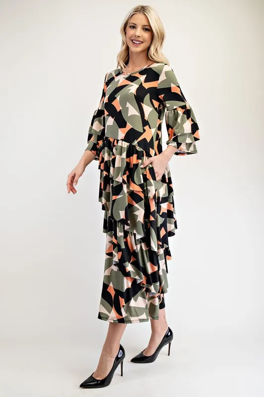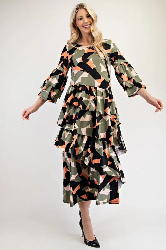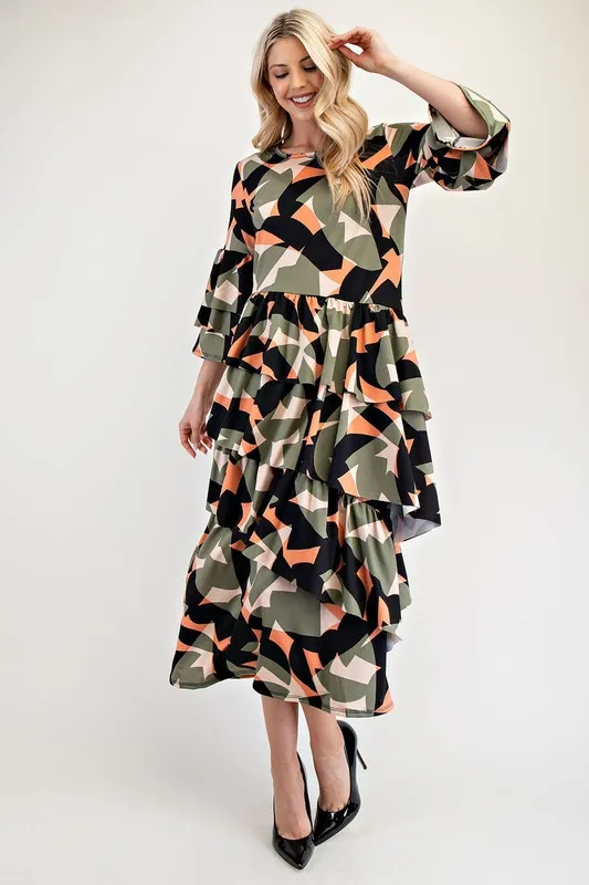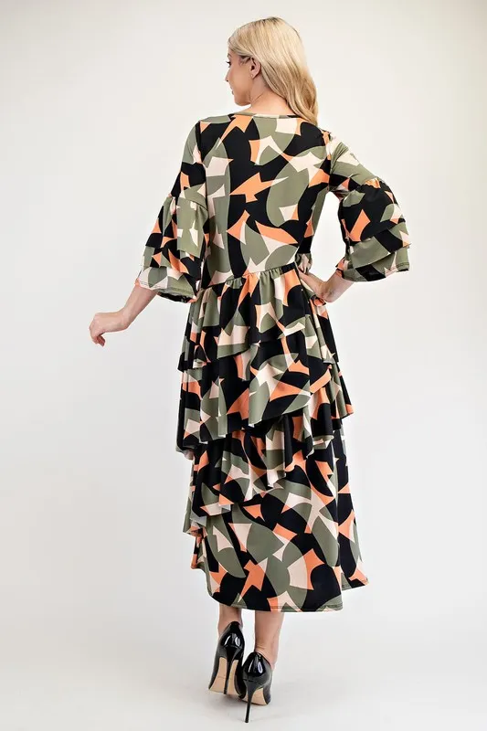 Full Size Printed Asymmetrical Ruffle Midi Dress Plus Size – Olive