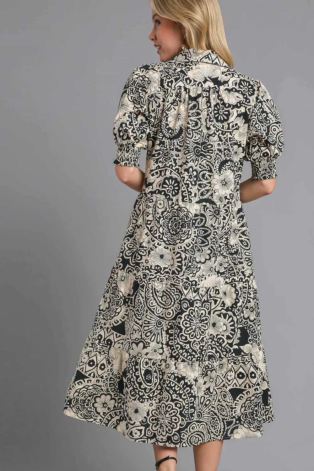 The Printed Smocked Cuff Puff Sleeve Midi Dress is a charming and stylish option for a variety of occasions. This dress features smocked cuffs with a delicate and feminine touch. The puff sleeves add a touch of drama. The midi length offers a flattering silhouette. The printed design adds a fun and playful element, making it a great choice for spring and summer events. Pair it with sandals or heels for a chic and trendy look.