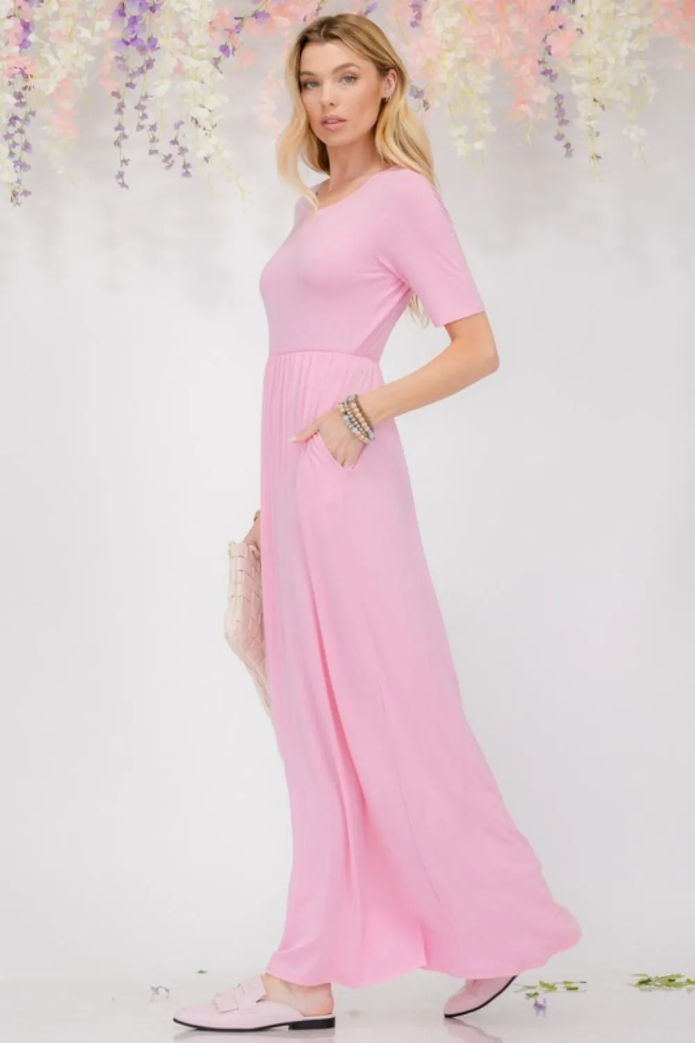 Full Size Round Neck Short Sleeve Maxi Dress with Pockets Plus Size – Pink