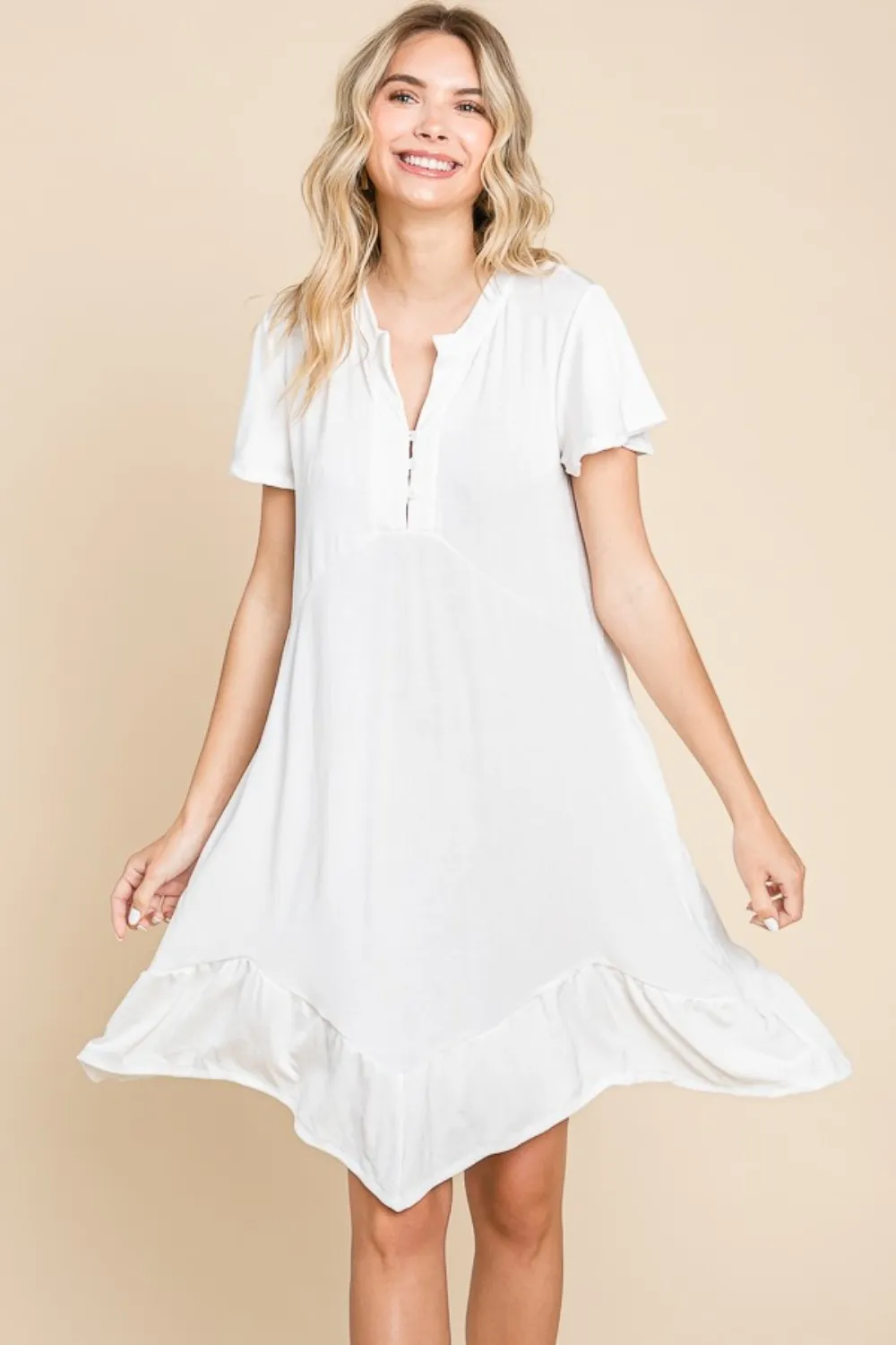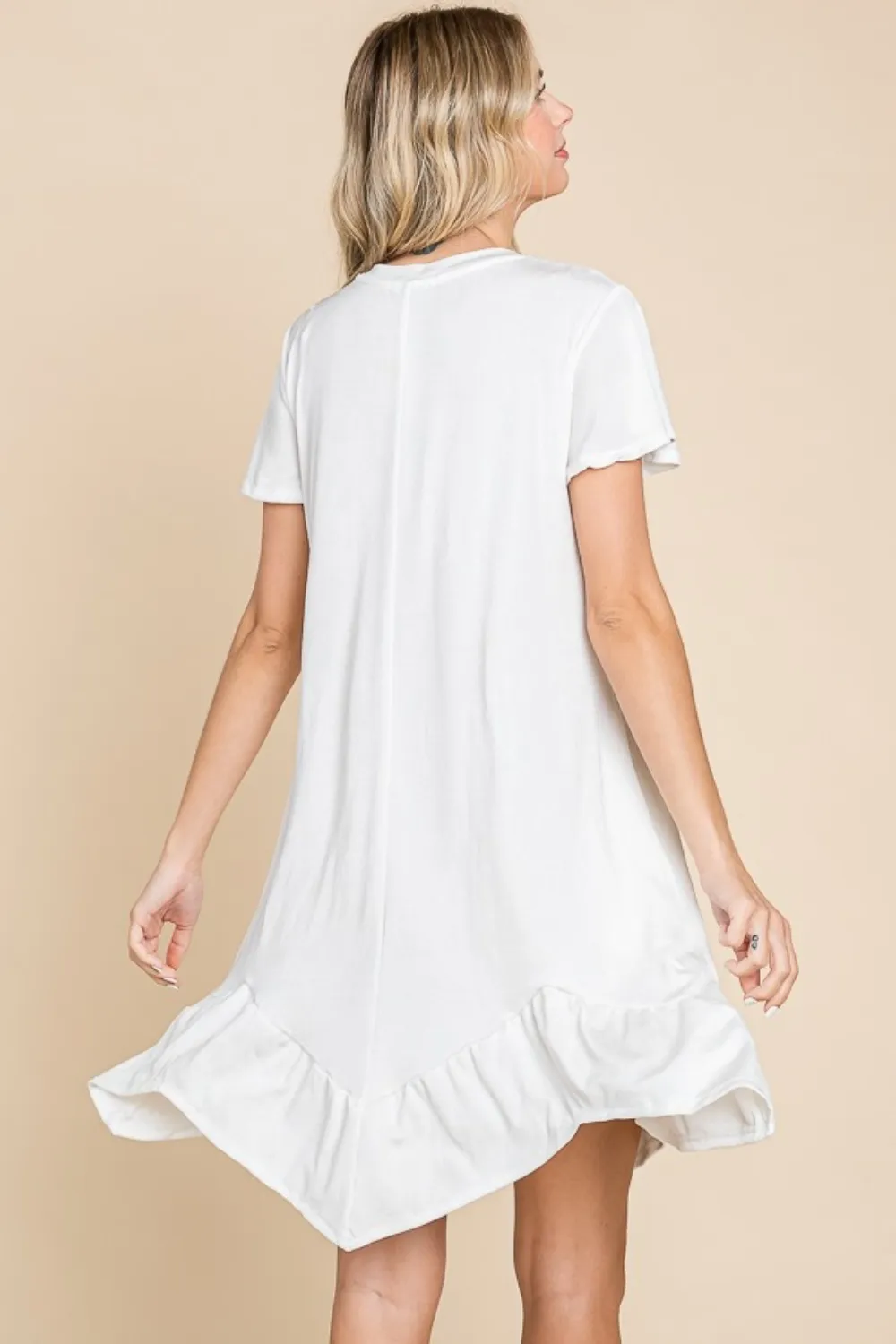 Full Size Short Sleeve Ruffled Asymmetric Hem Dress – Soft White