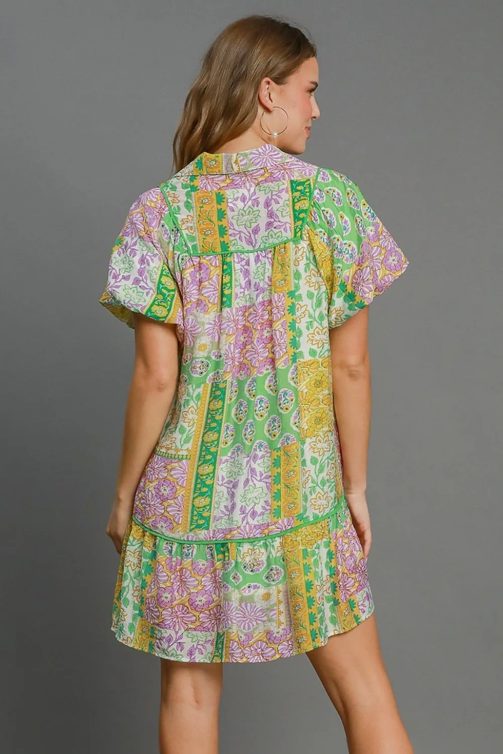Full Size Smocked Floral Puff Sleeve Mini Dress Plus Size – Green Mix