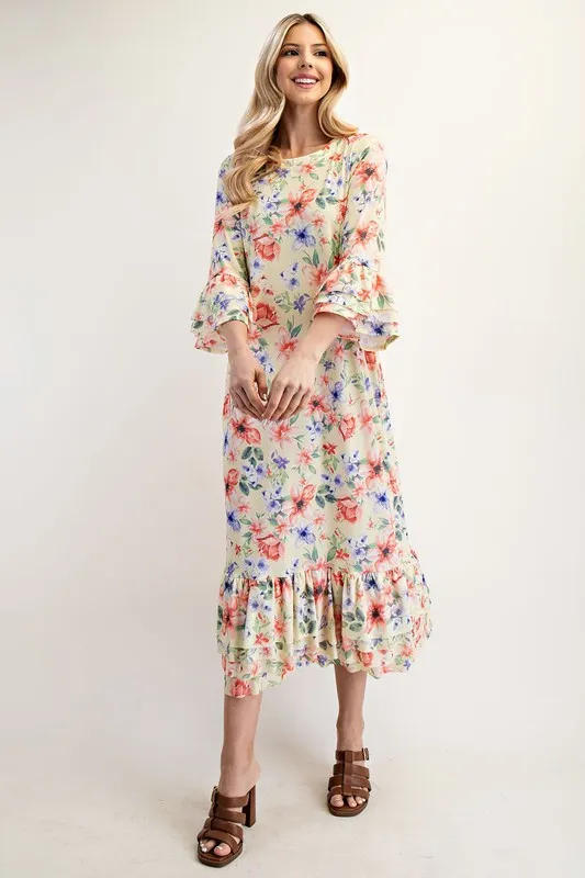Full Size Soft Floral Ruffle Trim Dress Plus Size – Yellow Floral