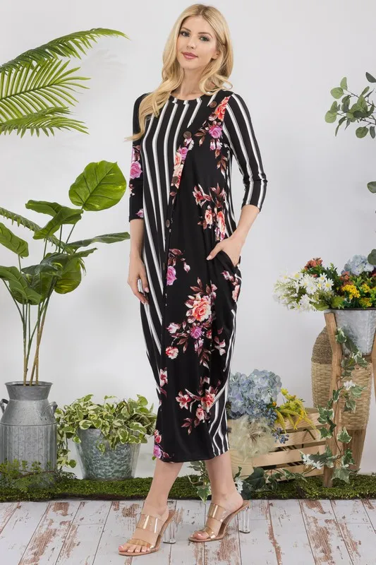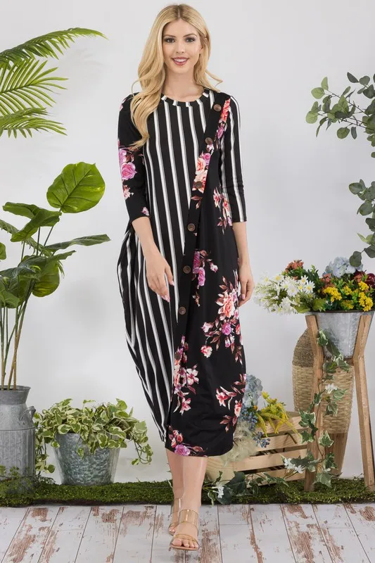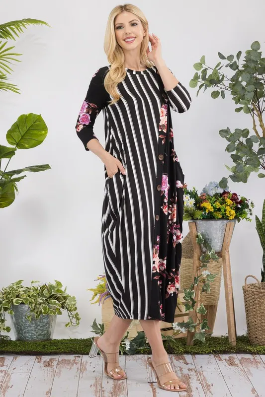 Full Size Stripe Floral Contrast Midi-Dress with Buttons Plus Size – Black Floral/Stripe