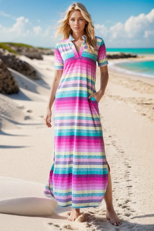 Full Size Striped Short Sleeve Maxi Tee Dress Plus Size – Pink Multi
