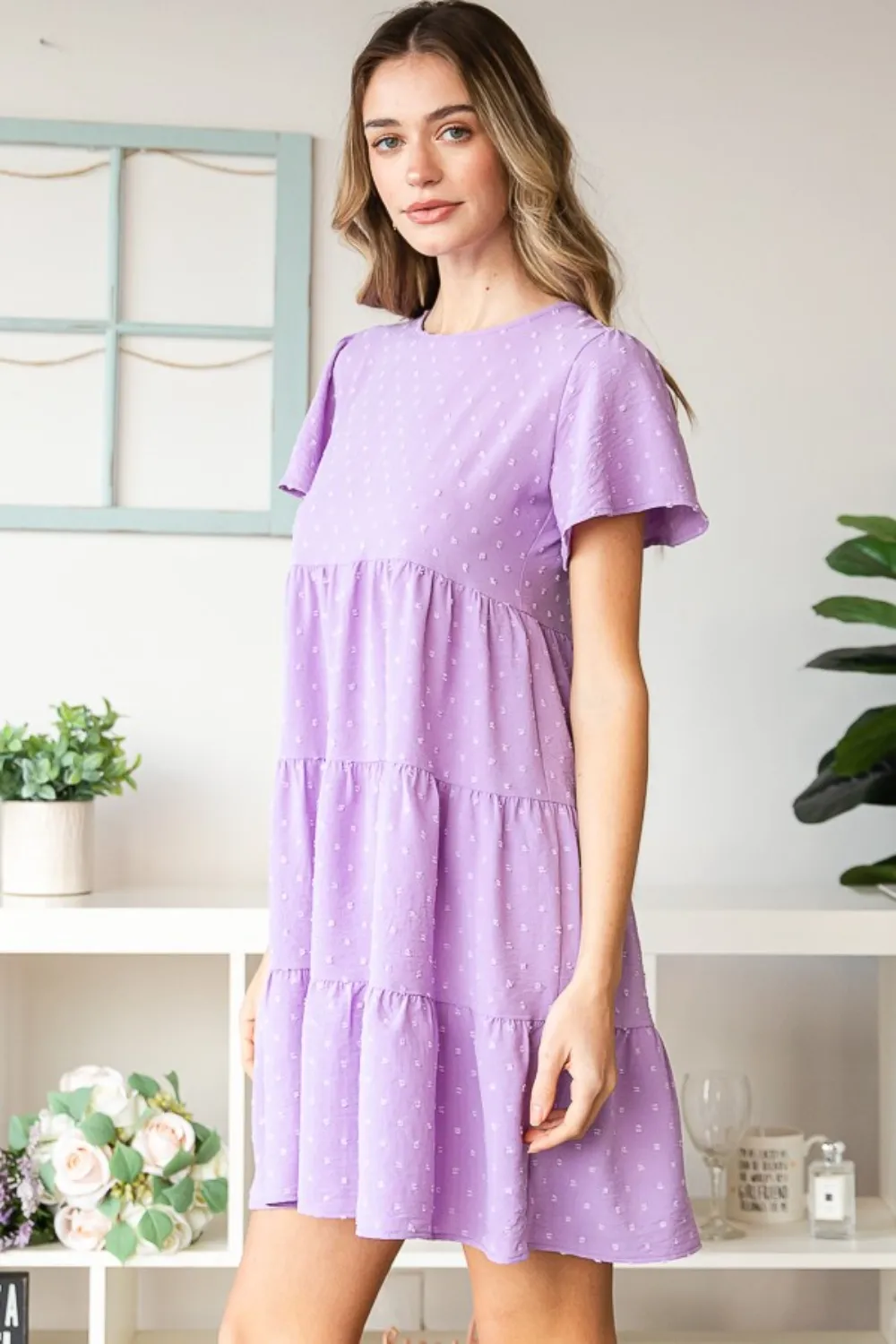 Full Size Swiss Dot Short Sleeve Tiered Dress – Lilac
