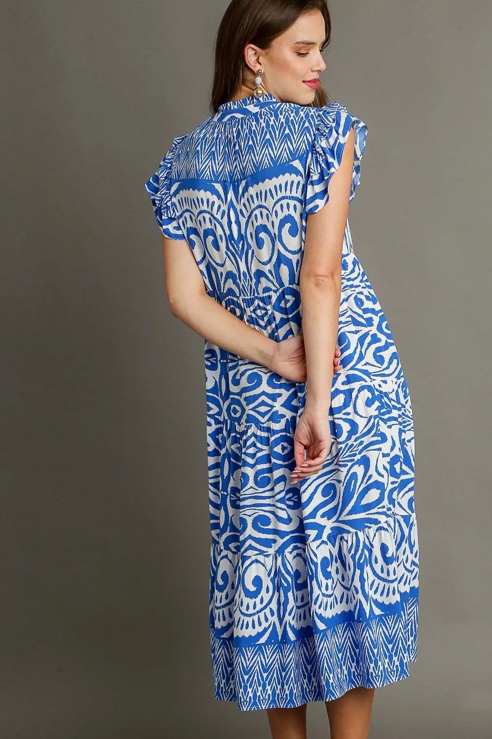 This midi dress showcases a two-tone border print, offering a striking and distinctive visual appeal. The ruffle cap sleeves add a charming and romantic touch to the dress, enhancing its overall elegance. The midi length provides a flattering and versatile silhouette that is perfect for various occasions. With its combination of prints and feminine details, this dress is a chic and sophisticated choice for any wardrobe.