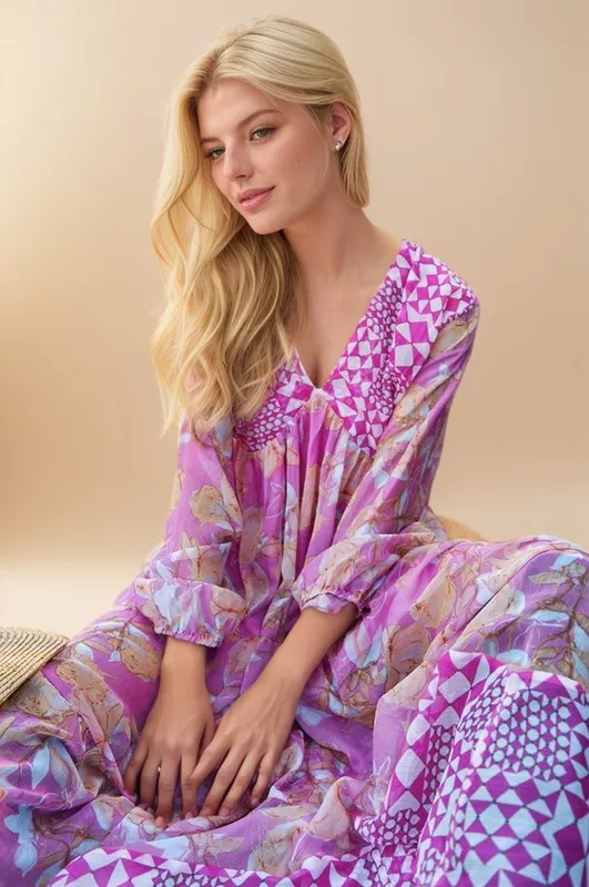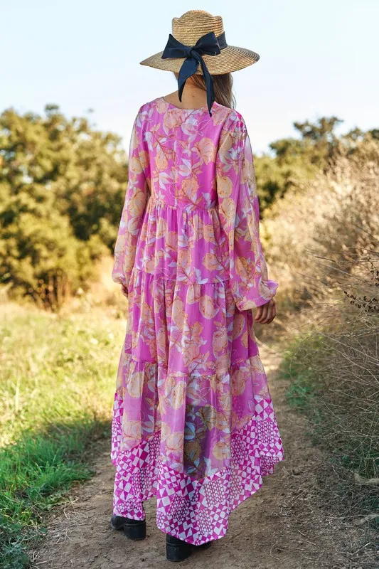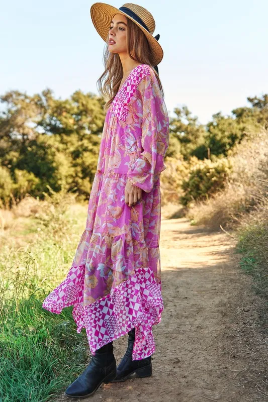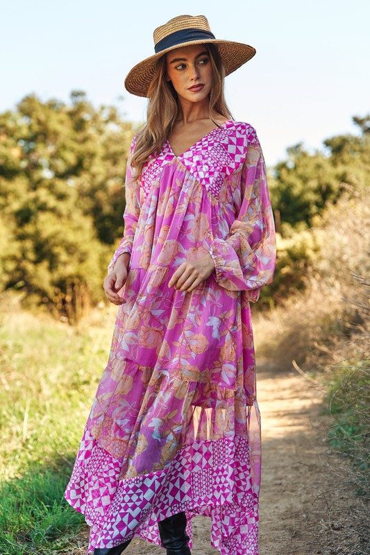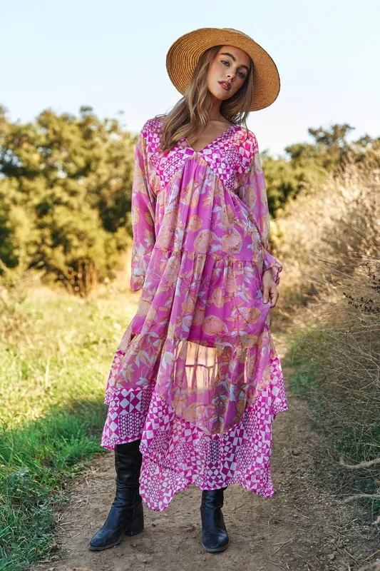 Geo and Floral Print Mixed Tiered Dress – Pink