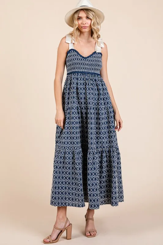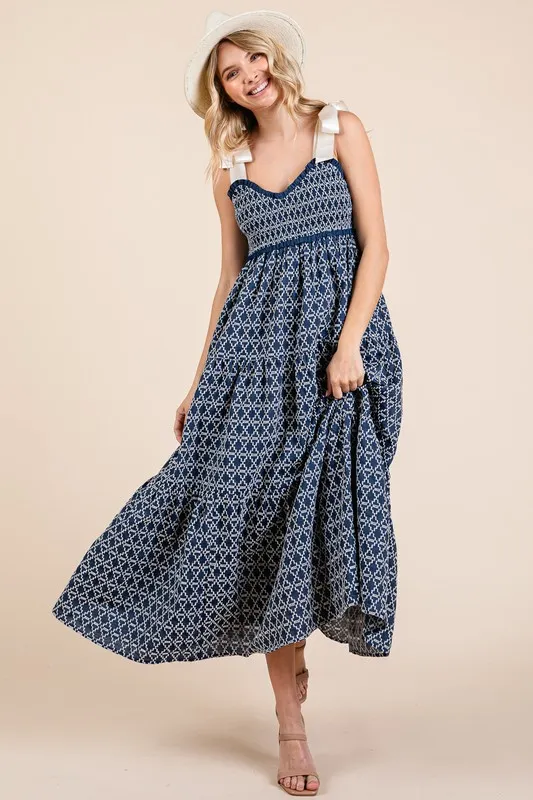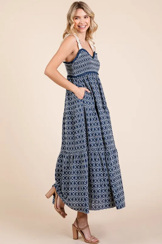 Geometric Embroidered Smocked Tie Shoulder Midi Dress – Dark Blue