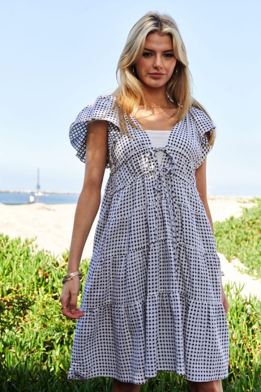 Jacquard V-Neck Flutter Cap Sleeve Tiered Dress – Black Ivory