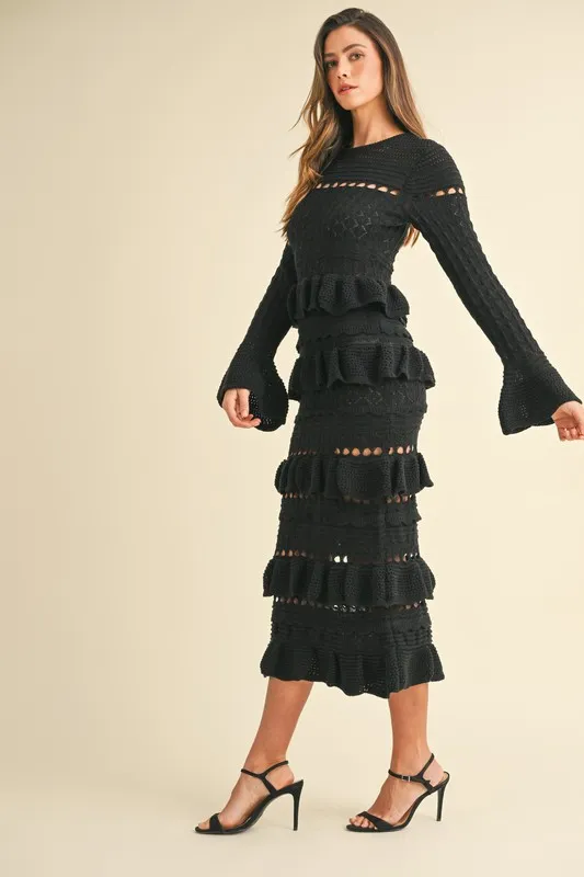 Long Sleeve Tiered Ruffle Knit Midi Dress – Black