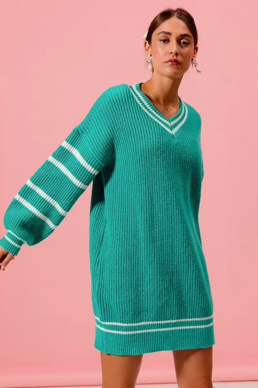Loose V Neck Sweater Dress with Striped Sleeves – Jade
