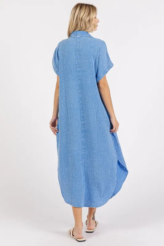 Mineral Wash V Neck Button Up Midi Shirt Dress – Denim