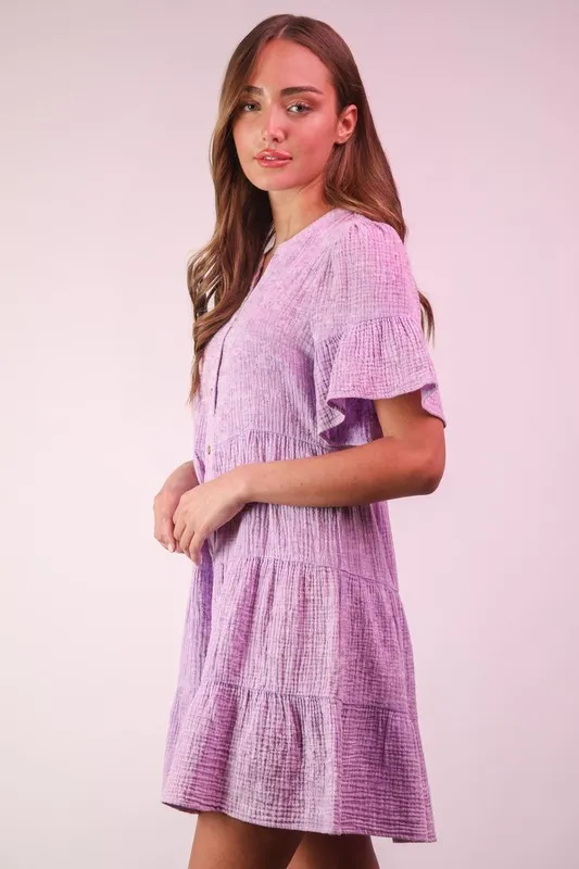 Mineral Washed Baby Bell Sleeve Woven Mini Dress – Lavender