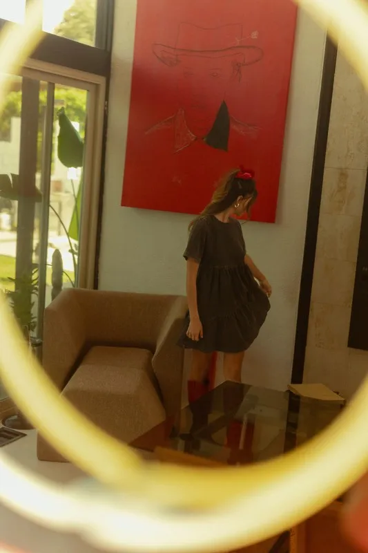 Mineral Washed Round Neck Short Sleeve Denim Dress – Black