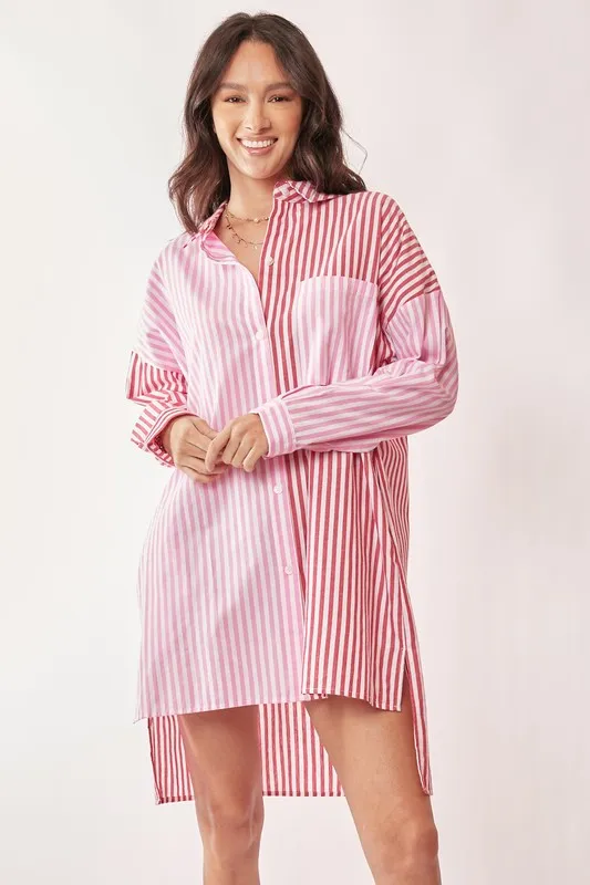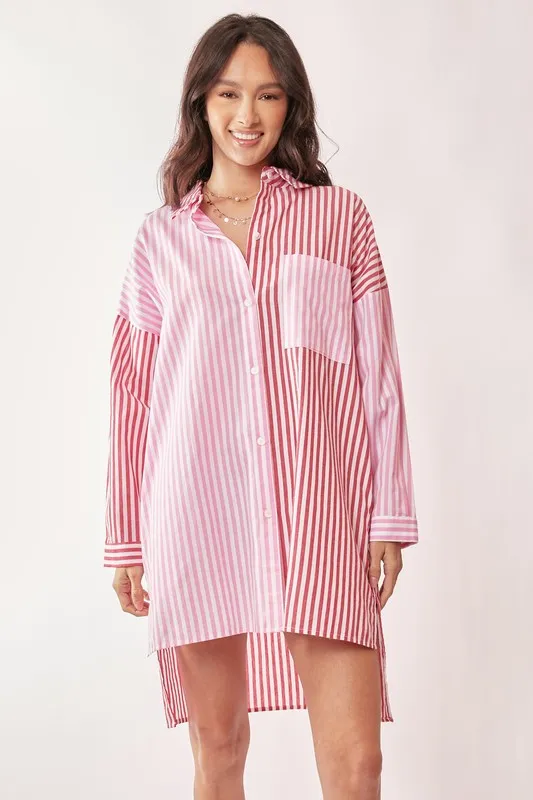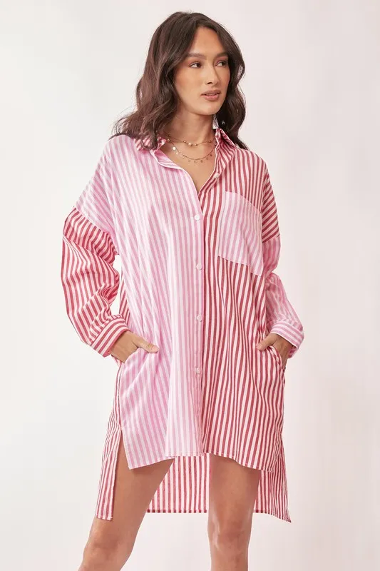 Multi Color Stripe Mixed Button Front Tunic Shirt Dress – Red Multi