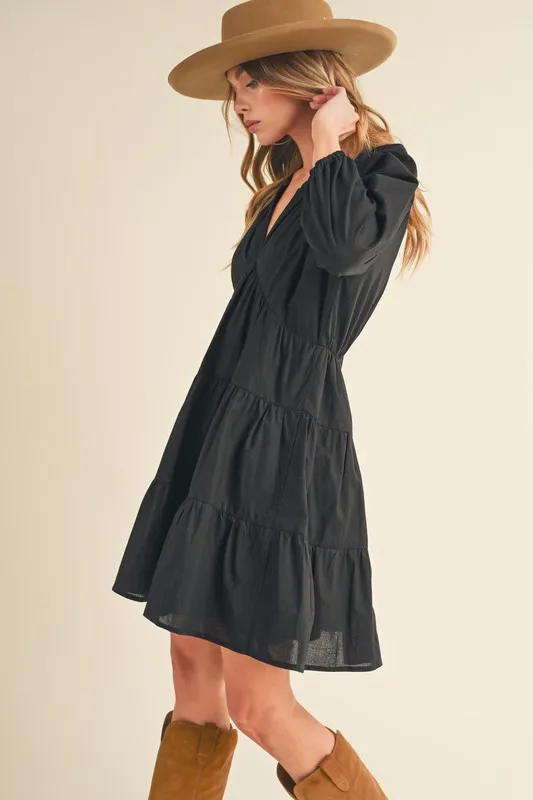 Notched Balloon Sleeve Tiered Mini Dress – Black
