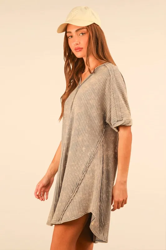 A mineral washed ribbed knit mini dress offers a trendy and stylish look. The ribbed knit fabric adds texture and comfort to the dress. The mineral wash treatment gives it a unique, slightly worn-in appearance. Perfect for a casual yet fashionable outfit.