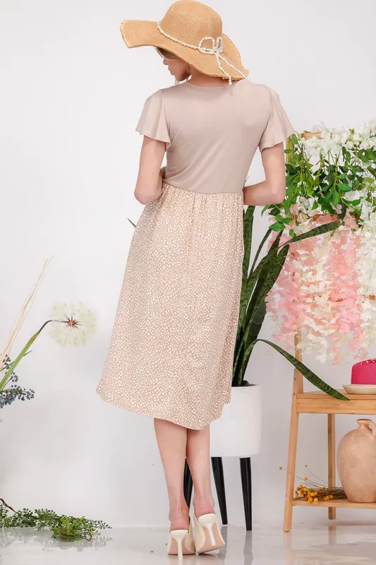Plus Size Polka Dot Round Neck Flutter Sleeve Midi Dress – Taupe/Khaki Polka