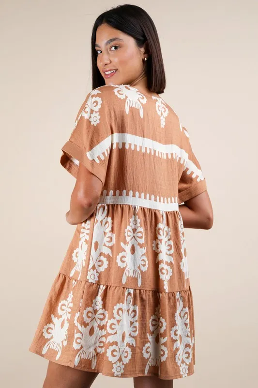 Plus Size Printed V-Neck Woven Mini Dress – Taupe