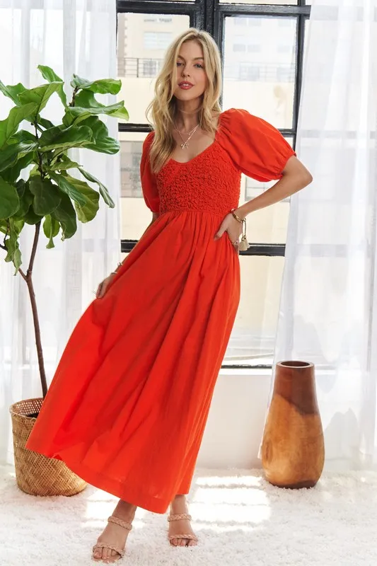 Popcorn Smocked Puff Sleeve Dress – Orange-Red