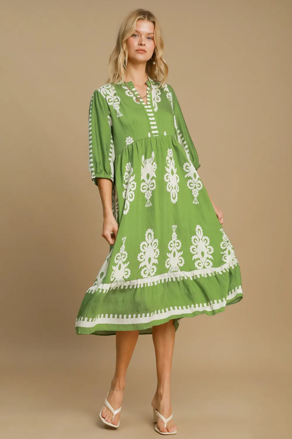 The Printed Notched Midi Dress features a stylish notched neckline and a flattering midi length. This dress is adorned with a chic print that adds a pop of interest to the design. Perfect for various occasions, from casual outings to semi-formal events, this versatile dress strikes the balance between classic elegance and modern style.