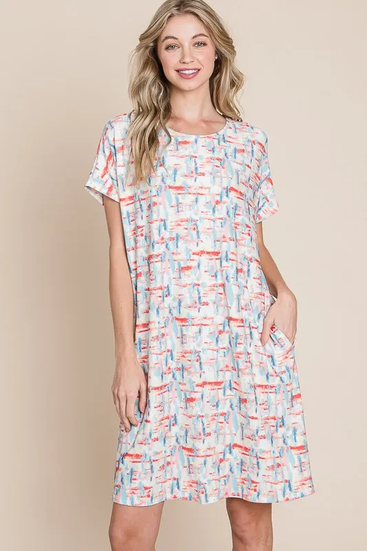Printed Round Neck Short Sleeve Tee Dress – Red