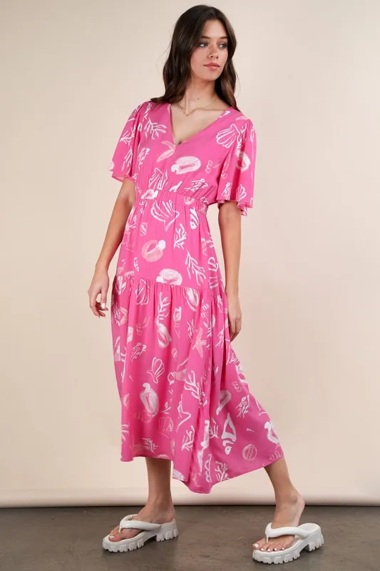 Printed V-Neck Resort Midi Dress – Pink