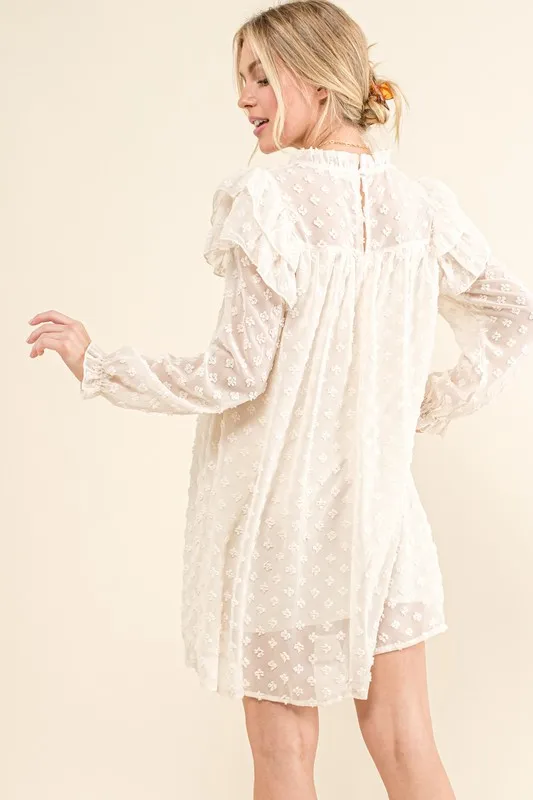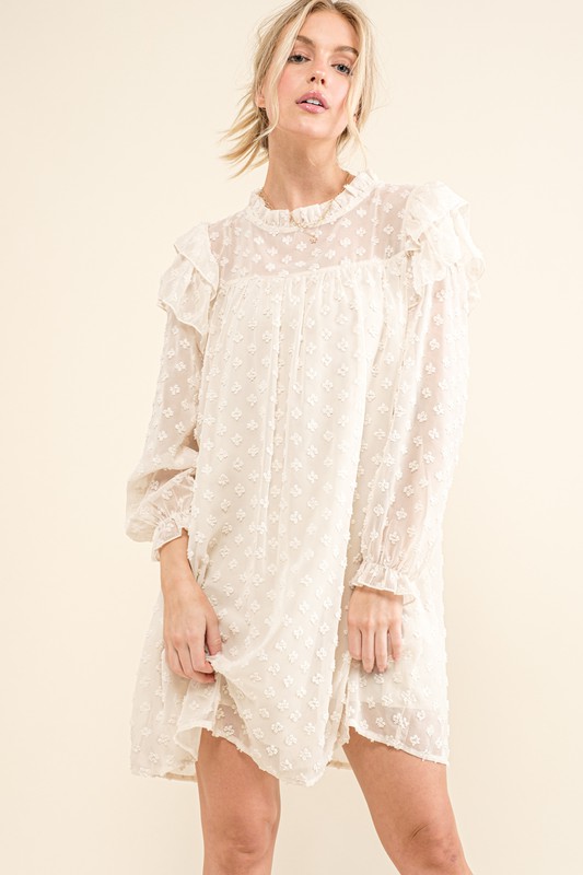 Ruffle Shoulder with Textured Woven Dress – Cream