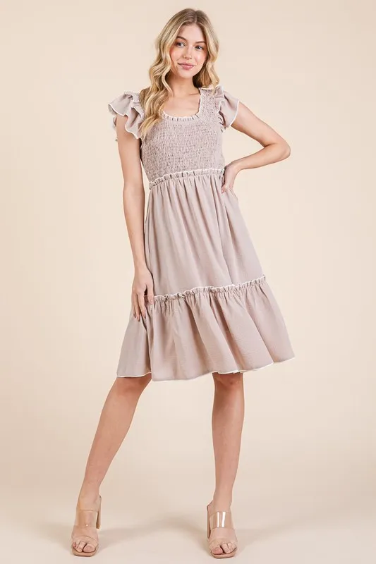 Ruffle Trim Smocked Dress with Contrast – Taupe