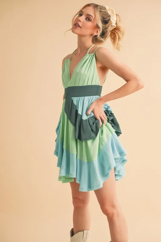 Ruffled Color Block Sleeveless Mini Dress – Green Combo