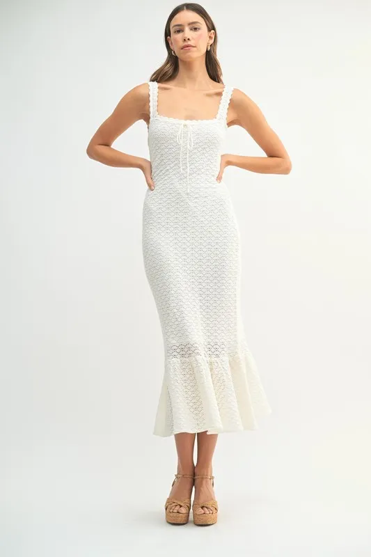Ruffled Hem Sleeveless Crochet Knit Midi Dress – Off White