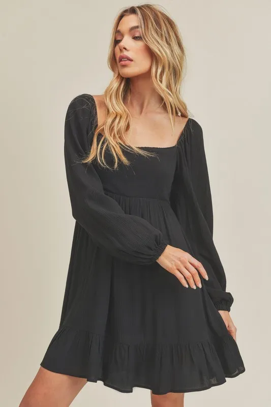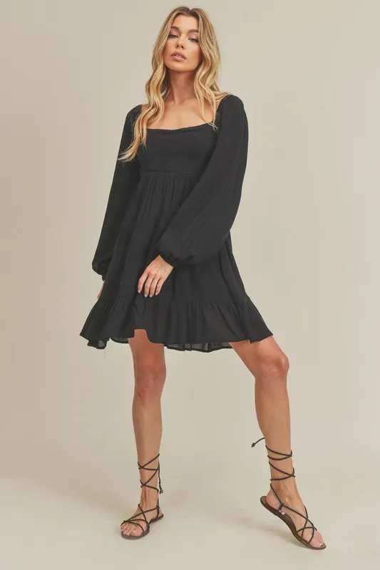 Ruffled Hem Square Neck Balloon Sleeve Mini Dress – Black