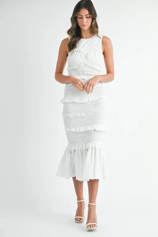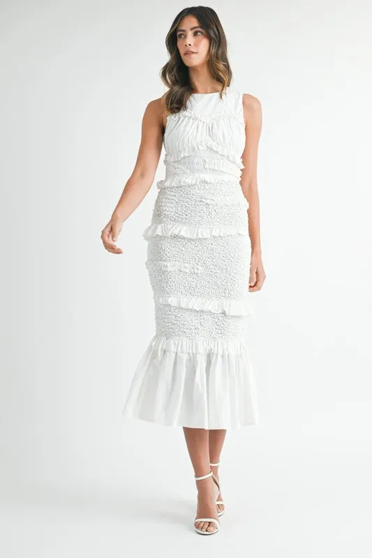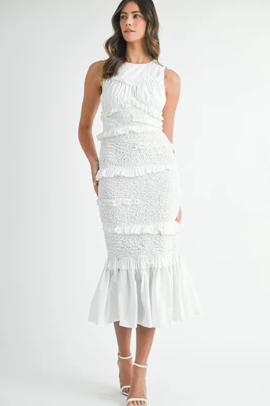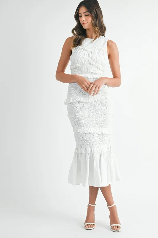 Ruffled Popcorn Smocked Mermaid Midi Dress – Off White