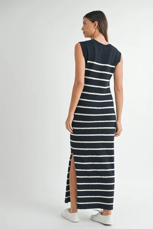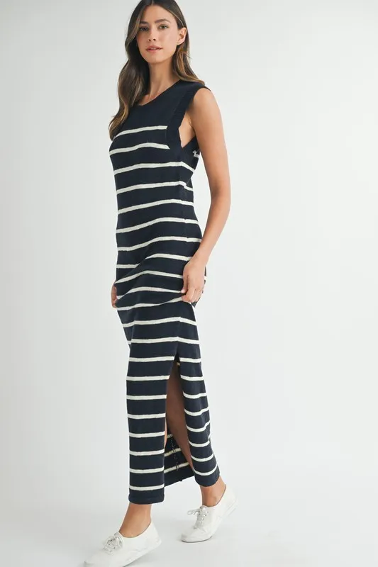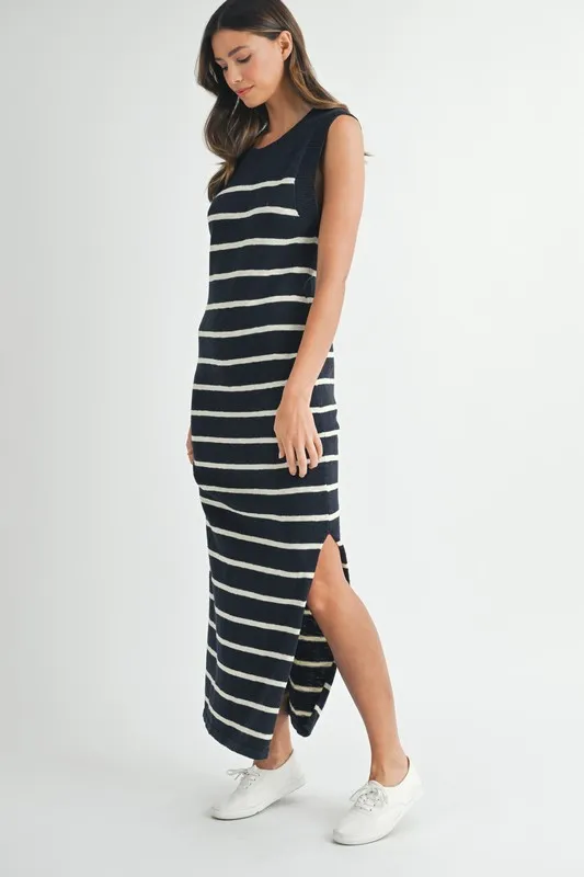 Sleeveless Stripe Sweater Maxi Side Slit Dress – Navy