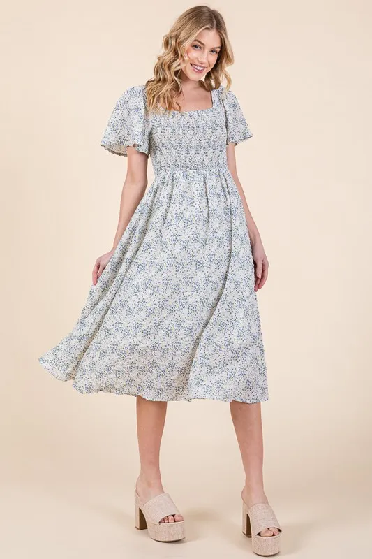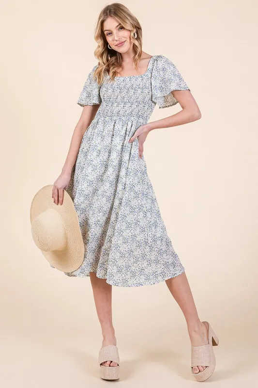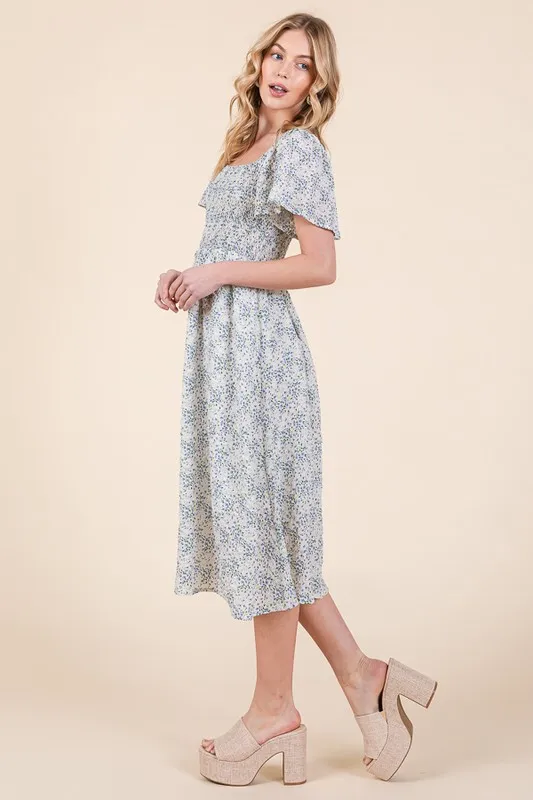 Smocked Floral Print Flutter Sleeve Midi Dress – White