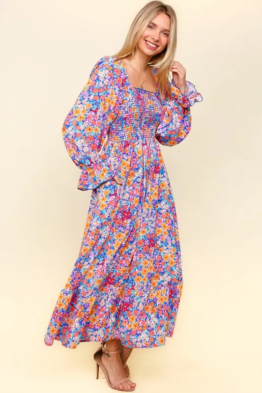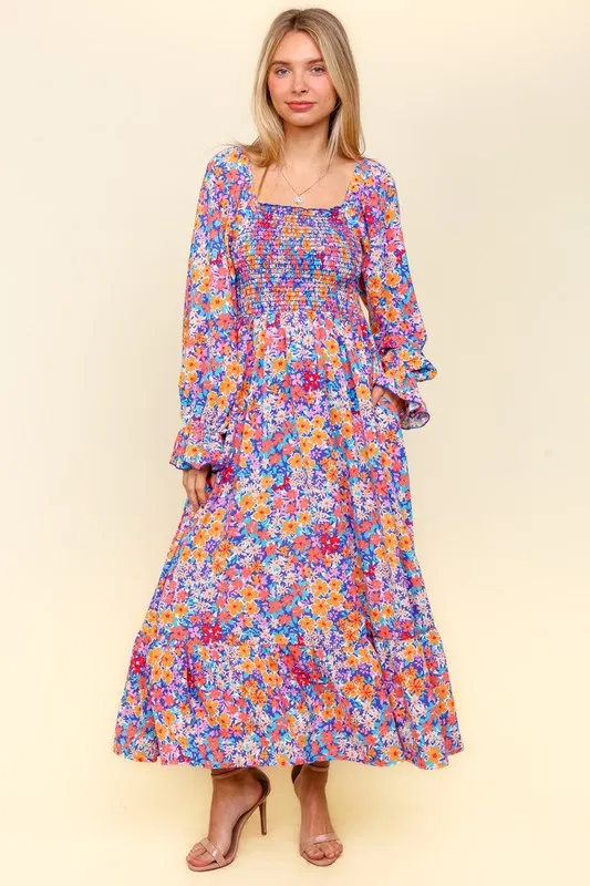 Smocked Floral Square Neck Flounce Sleeve Dress – Lavender/Coral