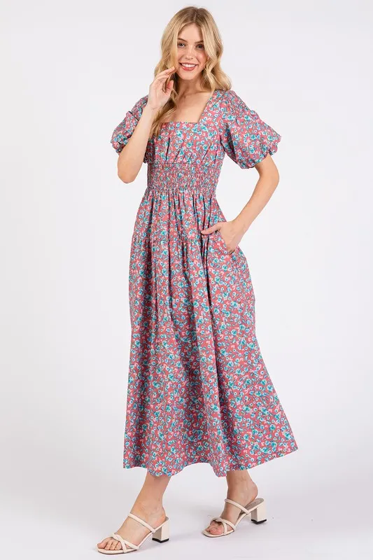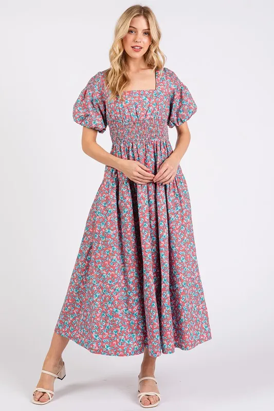 Smocked Floral Square Neck Puff Sleeve Midi Dress – Rose Pink