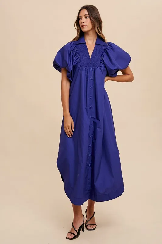 Smocked Puff Sleeve Midi Dress – Navy