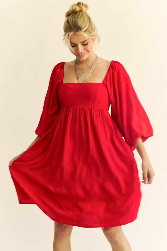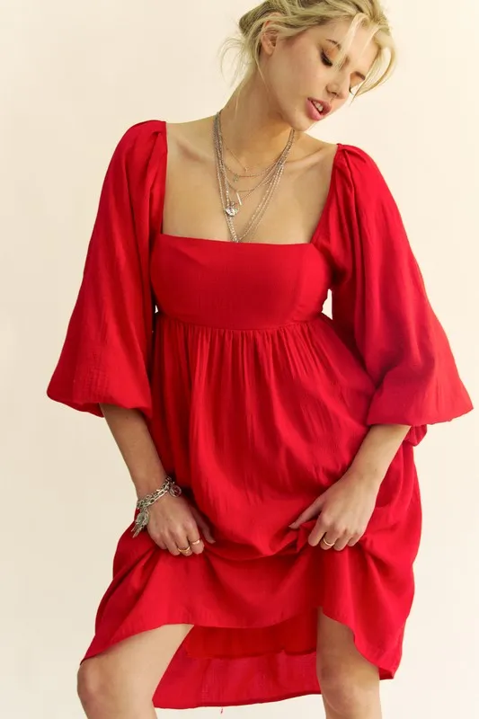 Solid Textured Fabric Puff Sleeve Tie Back Dress – Red