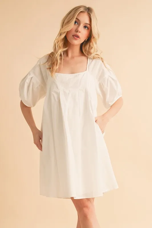 Square Neck Babydoll Dress with Pockets – White