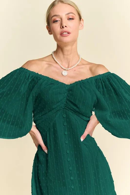 Swiss Dotted Ruched Ruffle Open Back Midi Dress – Forest Green