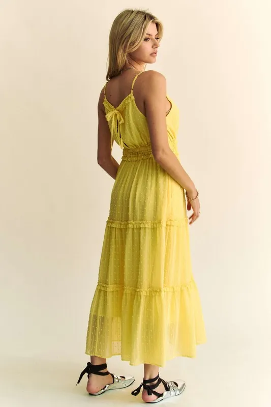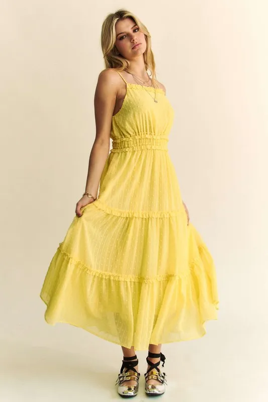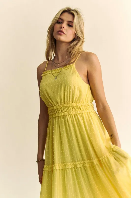 Texture Swiss Dot Ruffle Square Neck Midi Dress – Lemon