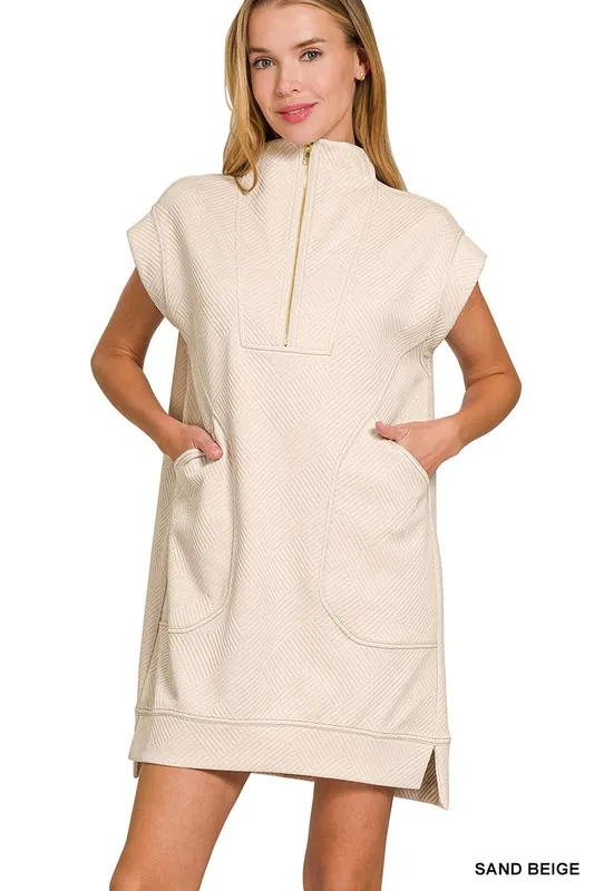 Textured Knit Jacquard Quarter Zipper Mini Dress – Sand Beige