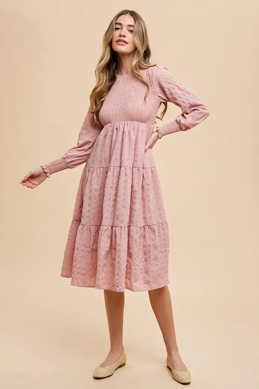 Textured Smocking Bodice Tiered Midi Dress – Mauve