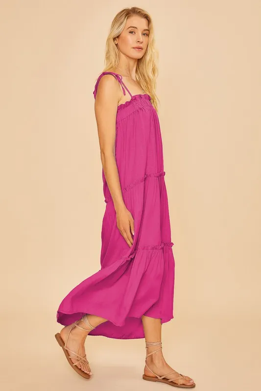 Tie Cami Elastic Detail Frill Tiered Midi Dress – Hot Pink